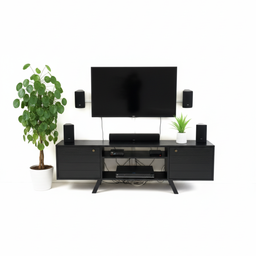 Con un tamaño estándar de 60” de largo x 12” de ancho x 18” de alto, brinda el espacio adecuado para colocar equipos multimedia, consolas, bocinas o elementos decorativos, manteniendo todo organizado y al alcance. Su diseño versátil se adapta a estilos modernos, minimalistas o rústicos.